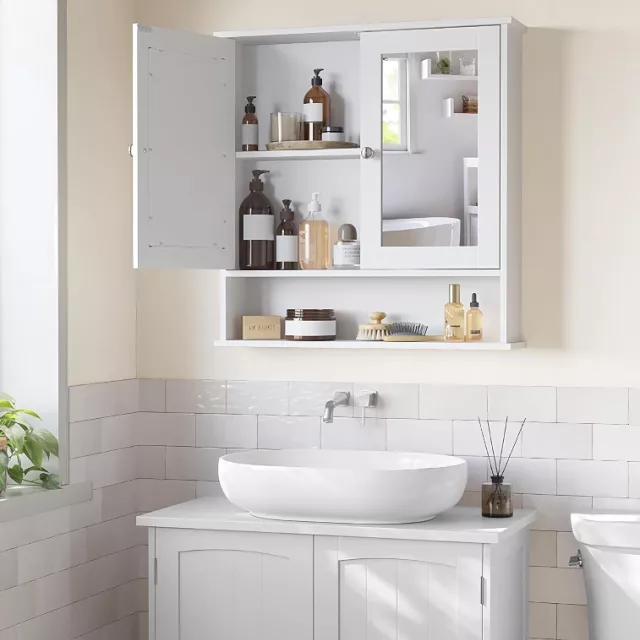 Transform your daily routine with a stylish wall-mounted bathroom cabinet designed to keep essentials organized and always within reach. This modern cabinet features two mirrored doors, a spacious adjustable shelf, and a convenient open compartment, giving you the perfect blend of storage and functionality. Its clean white finish adds a fresh, timeless touch to any bathroom décor, making it ideal for small spaces, busy households, and anyone who loves a neat, polished look.