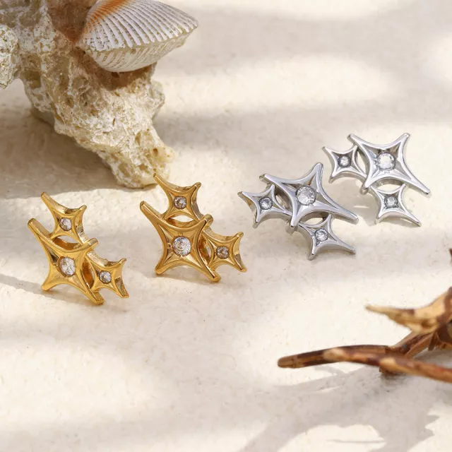 Elevate your everyday look with these elegant star-shaped stud earrings, perfectly designed to add a touch of glamour and charm. Crafted with 316L stainless steel and 18K gold plating, these earrings are not only visually stunning but also durable and long-lasting. Each set features three four-pointed stars joined together, highlighted by a sparkling zircon stone that catches the light beautifully, giving you a radiant, eye-catching shine.