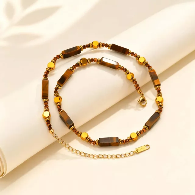 This necklace is crafted with a high-quality link chain that is durable yet lightweight, making it comfortable for all-day wear. The natural tiger eye stones provide a unique geometric pattern, ensuring no two pieces are exactly alike. Its gold-tone finish is achieved through a vacuum 3-layer plating process that resists fading, maintaining its luster over time. The necklace is also hypoallergenic, lead-free, and nickel-free, perfect for sensitive skin.