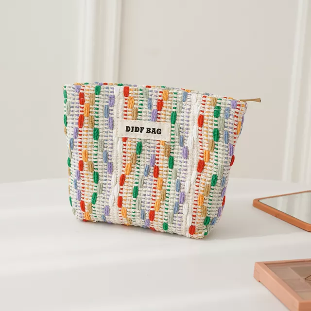 Keep your beauty must-haves, coins, and cards organized in style with this small woven makeup bag. Designed with a colorful pattern that adds a playful yet sophisticated touch, this pouch is more than just storage—it’s your new favorite daily companion. With its compact yet spacious build, it fits seamlessly into your handbag while holding all your essentials.